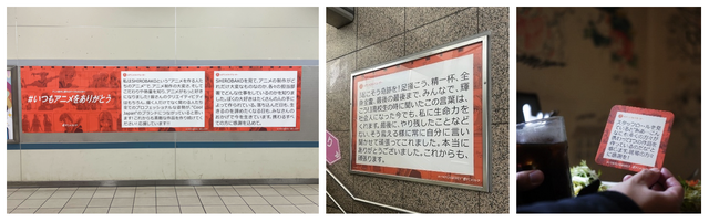『#いつもアニメをありがとう』で集まったコメントは、都内5エリア(池袋、荻窪、中野、武蔵堺、井荻)で見ることができる。