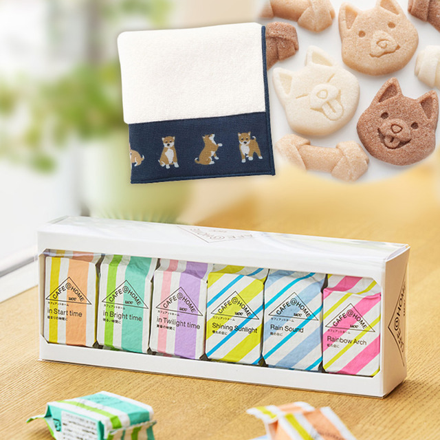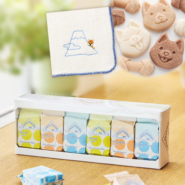 一方の「犬づくしコーヒーセット」のうち、「<タオル付き>犬づくし コーヒータイムセット」は「CAFE@HOME」のコーヒー6杯分と、「ワン!」と聞こえてきそうな無邪気な表情をした、かわいい犬型の砂糖が入ったセットだ。ころころとポーズを変える愛らしい豆柴柄のタオルは、落ち着いた藍色のかっこよさも持ち合わせる。