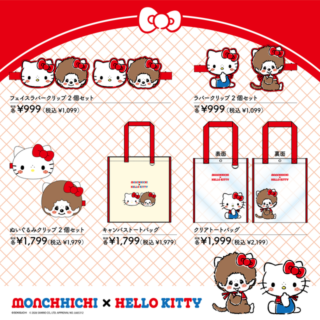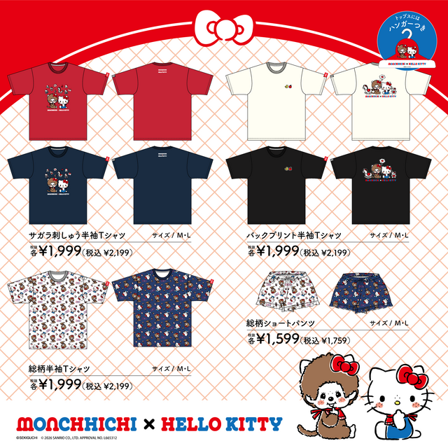 「サガラ刺しゅう半袖Tシャツ」や「総柄ショートパンツ」「長袖ジャージ上下セット」が展開されているウェアアイテムは、おそろいの赤いリボンをつけたモンチッチとハローキティがとってもかわいいデザインを用いている。Tシャツ・パーカー、ショートパンツ、長袖ジャージ上下セットの7アイテムを発売する。