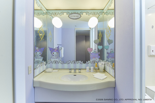 窓側やバスルーム、クローゼットの鏡など各所にも「クロミ」のデザインが溢れているほか、部屋に設置された額縁の中の作品も楽しめる。