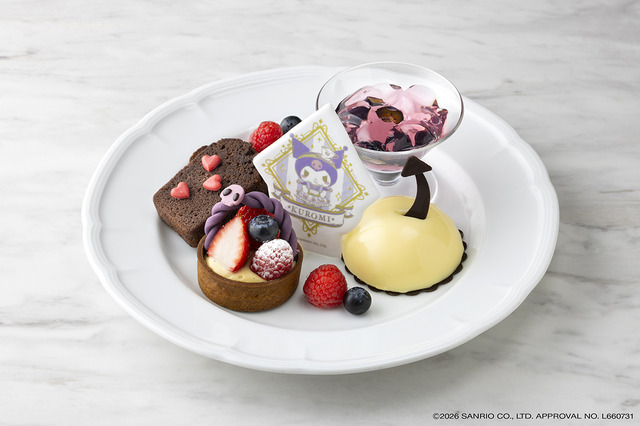 「クロミデザートプレート」は、苺やラズベリー、ブルーベリーをカスタードクリームの上に飾って花かごに見立てたフルーツタルトや、ブルーベリーのジュレをレアチーズのムースで包んで「クロミ」をイメージしたケーキなどが載ったプレート。程よいフルーツの酸味とコクのある甘さ、さらに食感も楽しめる一皿だ。