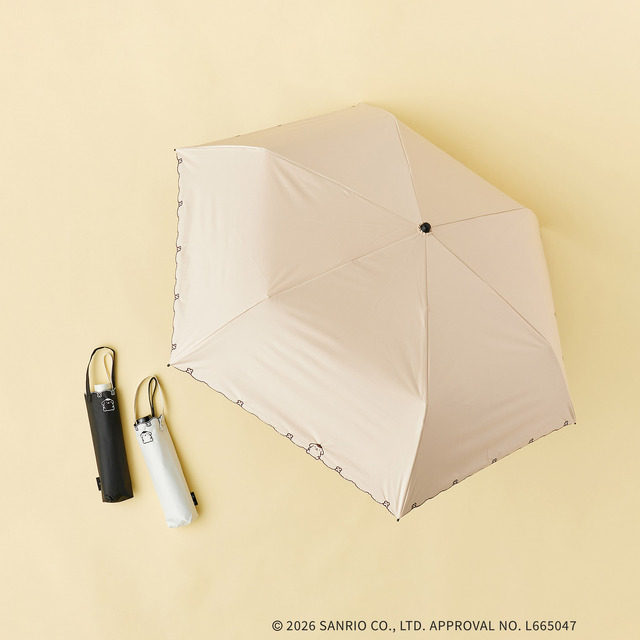 ポムポムプリンの刺繍デザインが可愛らしい、晴雨兼用の折りたたみ傘も。収納ケースにもポムポムプリンの刺繍が施されており、大人でも持ちやすいシックなデザインが魅力だ。