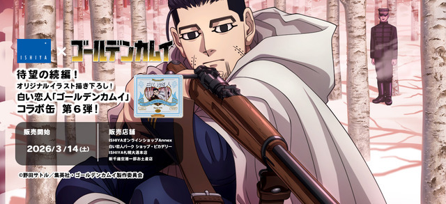 TVアニメ『ゴールデンカムイ』と「白い恋人」がコラボ。2026年3月14日(土)に白い恋人36枚入『ゴールデンカムイ』コラボ缶を数量限定で販売する。