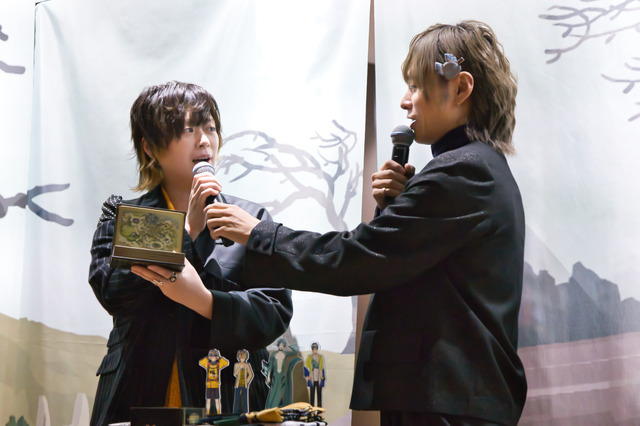 新作グッズの紹介コーナーでは、アクリルスタンドや靴下のほか、2人が「おしゃれ!」と気に入った様子のベイクドショコラとティーセットも登場。展覧会に登場するイベントをモチーフとしたティーバッグのパッケージを眺めながら「これを開けるのはもったいなさも感じますが、心を強く持ってもらって飲んでもらえたら」と岡本がイチオシ。市川はベイクドショコラの箱を手に、蓋裏にデザインされたナイトレイブンカレッジのお馴染みの地図を眺めて「食べ終わったあと、ぜひインテリアに」と目を細めた。