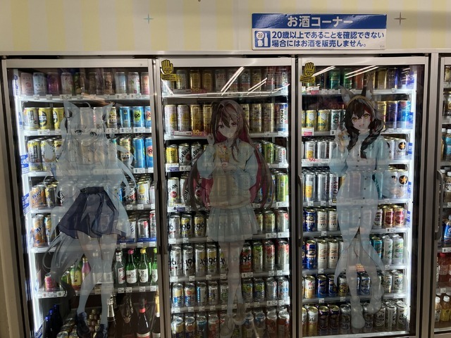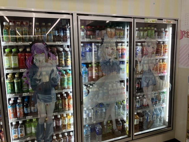 東京の渋谷道玄坂上店はレジ周辺をはじめ店内壁面、アイスショーケース、各種飲料や冷蔵・冷凍商品を取り扱うリーチインケースまで、白上フブキ、AZKi、大神ミオ、常闇トワ、フワワ・アビスガード、モココ・アビスガードたちで賑やかに彩られた。