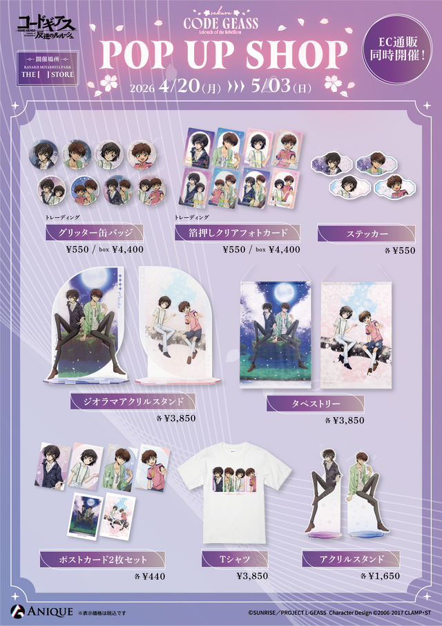 『コードギアス 反逆のルルーシュ』よりルルーシュ&スザクを描き下ろしたグッズが登場。POP UP SHOPにて販売するほか、ECサイトにて予約受付中。