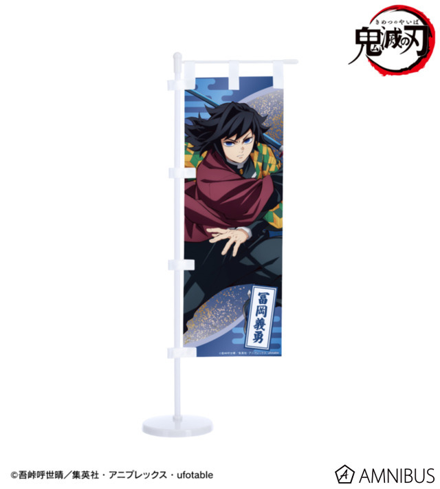 「ミニのぼり」は、竈門炭治郎、我妻善逸、冨岡義勇、胡蝶しのぶ、猗窩座のイラストをミニサイズののぼりに仕上げられたアイテムだ。付属の台座は組み立て式のため、飾って楽しんだり、分解してイベントなどへ持ち運ぶことも可能。