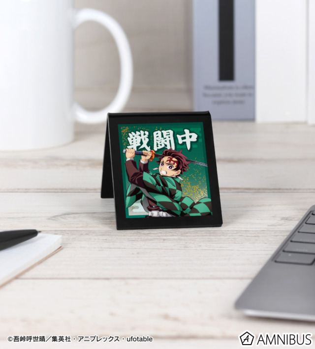 「アクリルサインプレート」は、竈門炭治郎、我妻善逸、冨岡義勇、胡蝶しのぶ、猗窩座のイラストをデスクや棚に立てて飾れる自立型のアクリルサインプレートに仕上げられた。V字構造のため、台座を使わずにそのまま安定して設置できる。