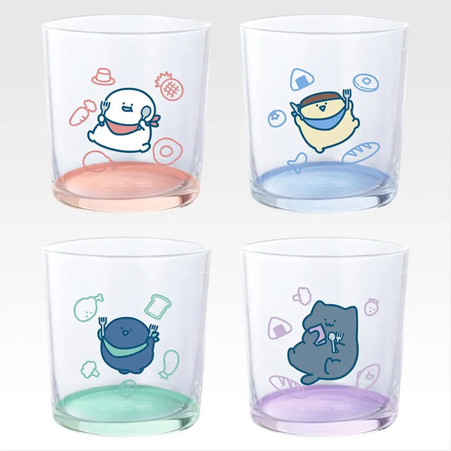 D賞「カラフルお冷グラス」は、描きおろしイラストを使用したグラス。底面がそれぞれがつけているナプキンと同じカラーになっていて、飲み物を注ぐ前からとってもかわいい。