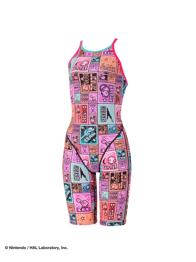 ゲーム特有のデジタルドット画にてデザインされたSpeedoオリジナル協業グラフィック。協業だからこそのグラィックだ。ゲーム中に登場するカービィのさまざまな表情が楽しめるのも魅力。ジュニア層はもちろん、マスターズ層も取り入れやすいレトロゲームの総柄デザインとなっている。