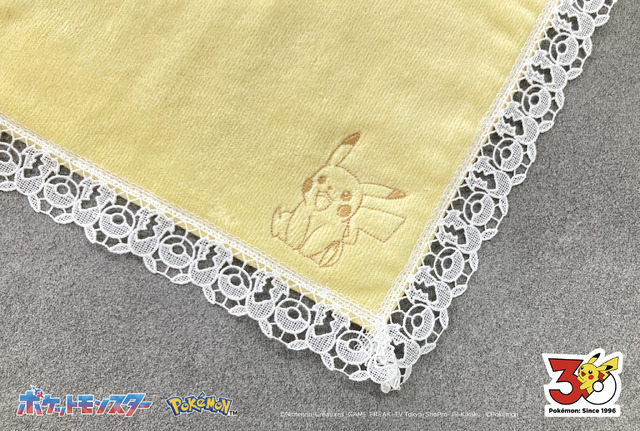 このたび、本作の人気キャラクター・ピカチュウがデザインされたハンカチが登場。商品は「レース付きタオルハンカチ」と「刺繍ハンカチ」の2パターンが展開。