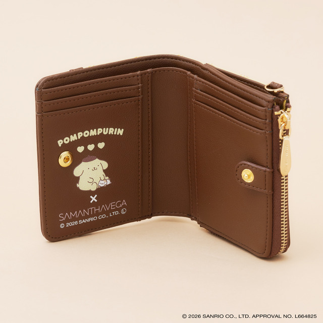 「折財布」は、バッグのデザインとリンクした折財布。フロントとカード収納箇所には、ポムポムプリンとお友達の“マフィン”がデザインされており、中まで可愛さが詰まったアイテムだ。