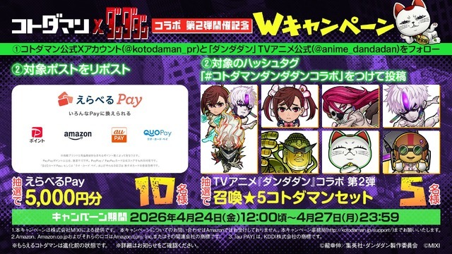 さらにコラボ開催を記念して、X(旧Twitter)では「えらべるPay®」や「TVアニメ『ダンダダン』コラボ 第2弾 召喚★5コトダマンセット」が抽選で当たる企画も行われる。なお本コラボの詳細は、4月27日20時より『コトダマン』公式YouTubeチャンネルの『コトダマン公式放送【GODステーション】』で発表されるのでぜひチェックしてみよう。