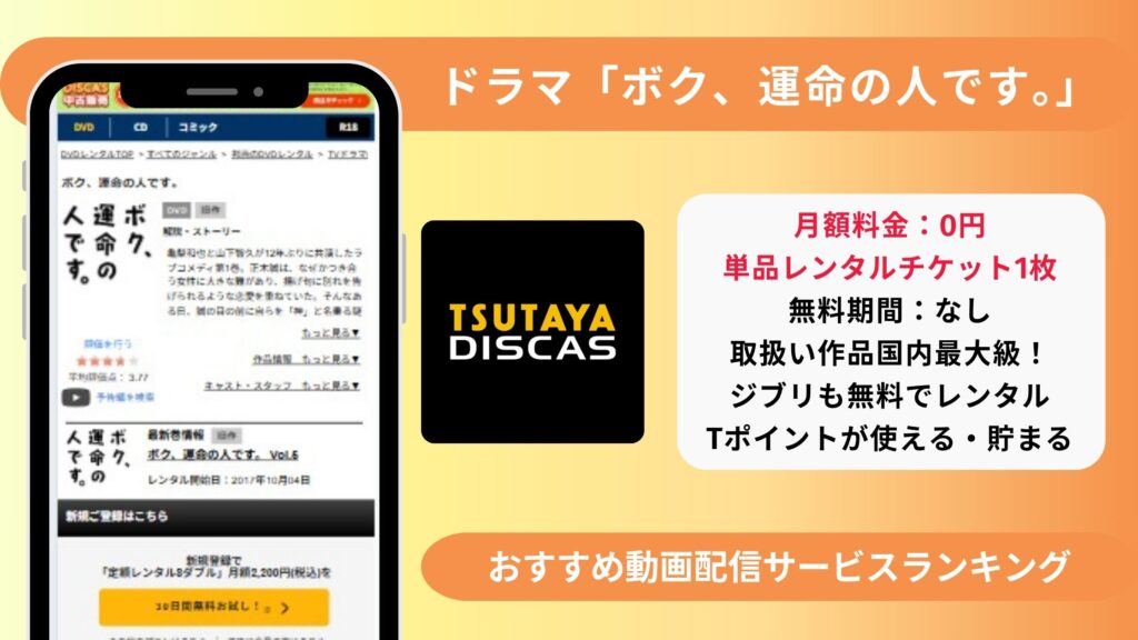 知りたいことまでジャンプ ドラマ「ボク、運命の人」を見れるサブスク動画配信アプリ・サイトはどれ?→TSUTAYADISCASのDVDレンタルあり ドラマ「ボク、運命の人」はAmazonプライム・Netflix・U-NEXT・Huluで配信されている?→配信なし ドラマ「ボク、運命...
