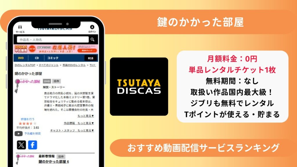 知りたいことまでジャンプ ドラマ「鍵のかかった部屋」が視聴できるサブスク一覧→TSUTAYA DISCASの無料トライアルで全話無料視聴可能 ドラマ「鍵のかかった部屋」はFODで配信ある?→配信あり ドラマ「鍵のかかった部屋」はAmazonプライムで配信ある?→配信... -