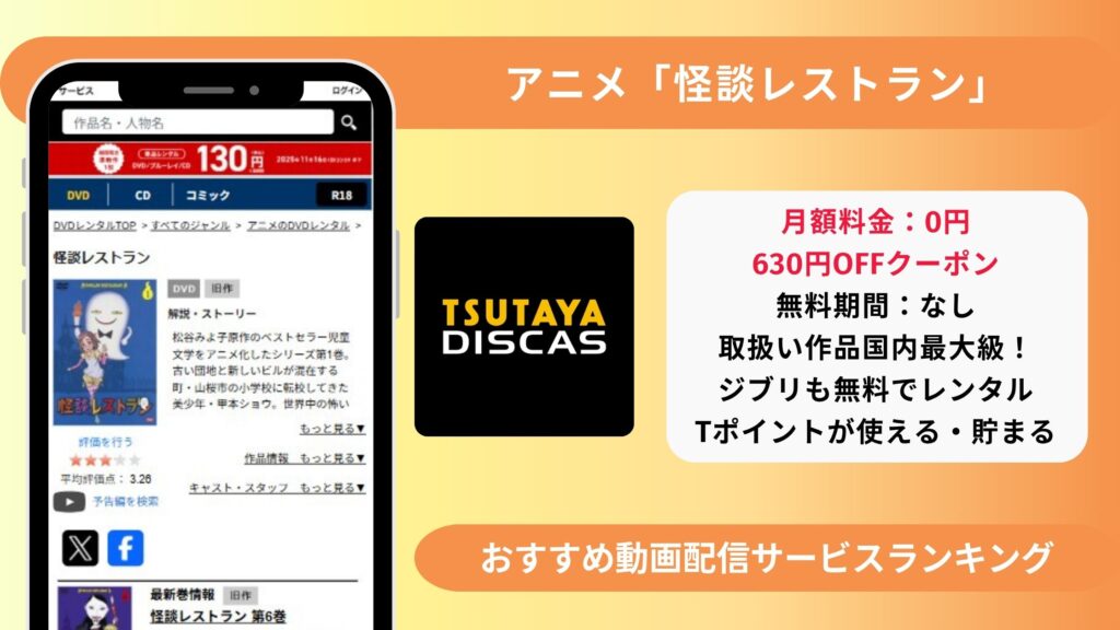 知りたいことまでジャンプ アニメ「怪談レストラン」を見れる配信サイト・アプリを比較 アニメ「怪談レストラン」は TSUTAYA DISCASのDVDレンタルで視聴できる?→DVDレンタルあり アニメ「怪談レストラン」はAmazonプライムビデオ(アマプラ)・Netflix・H... -