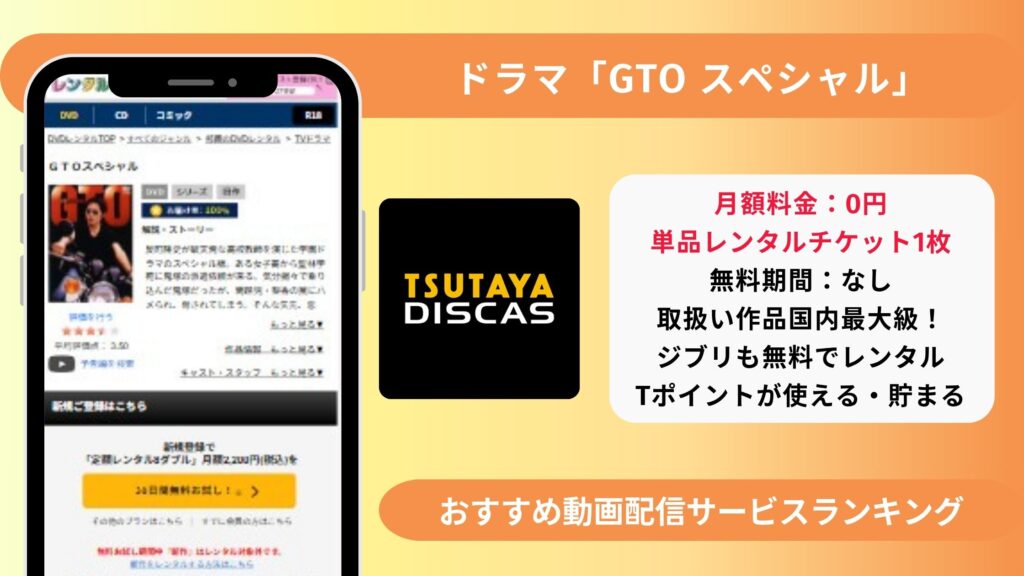 知りたいことまでジャンプ ドラマ「GTO スペシャル」を無料でフル視聴できる動画配信サイトを調査→TSUTAYA DISCASの無料トライアルで全話無料視聴可能 ドラマ「GTO スペシャル」Amazonプライム・Netflix・U-NEXTで配信されている?→配信なし ドラマ「GTO ... -