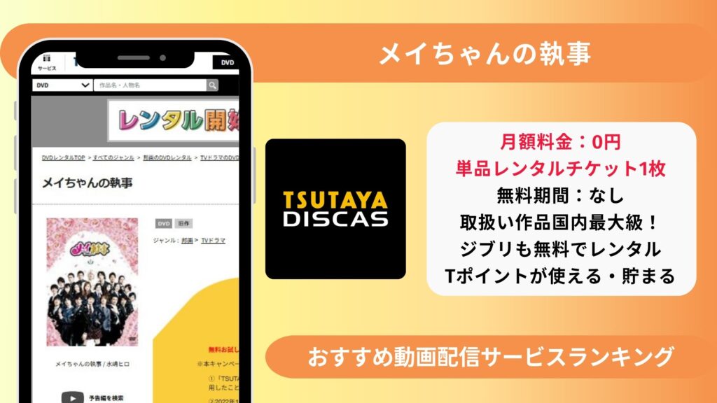 知りたいことまでジャンプ ドラマ「メイちゃんの執事」を全話視聴できる動画配信サービスはどこ?→TSUTAYA DISCASの無料トライアルで全話無料視聴可能 FODでドラマ「メイちゃんの執事」の配信はある?→配信あり Amazonプライムでドラマ「メイちゃんの執事... -
