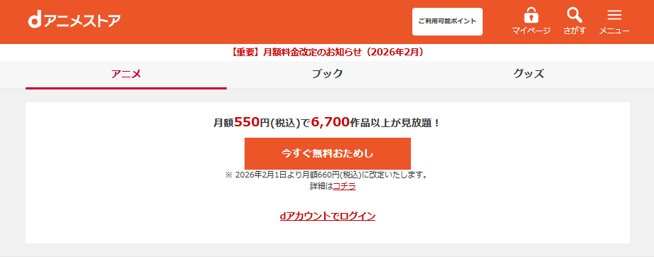 dアニメストアは、月額550円(税込)で6,700作品以上見放題(見放題対象外コンテンツがあります)というコスパの良さが特徴です。