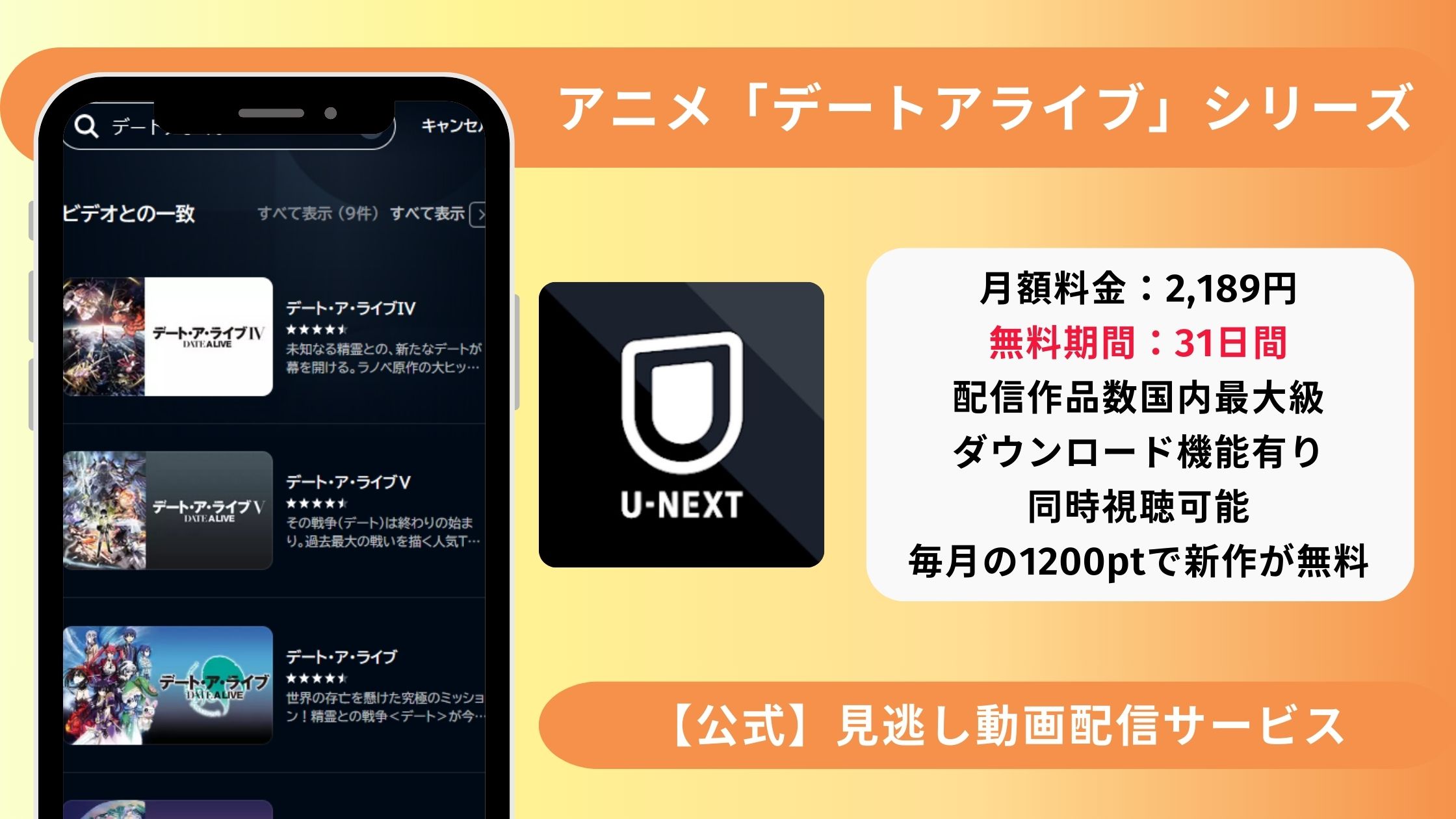 U-NEXTは「デート・ア・ライブ」シリーズの全作品(1期から5期まで、劇場版、OVAを含む)を見放題で配信中。