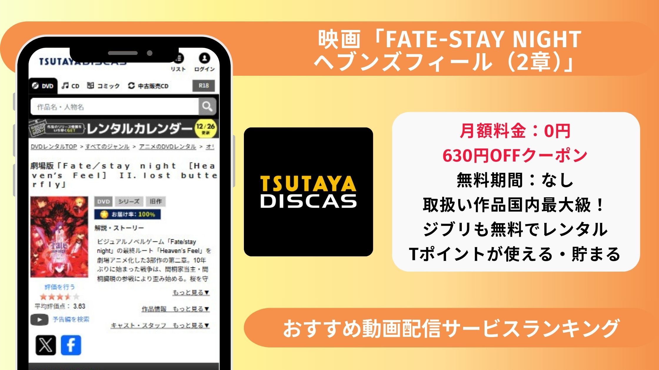 映画「Fate-stay night ヘブンズフィール(2章)」を無料で視聴できる動画配信サービスを調査した結果、唯一の見放題対応サービスはTSUTAYA DISCASです。