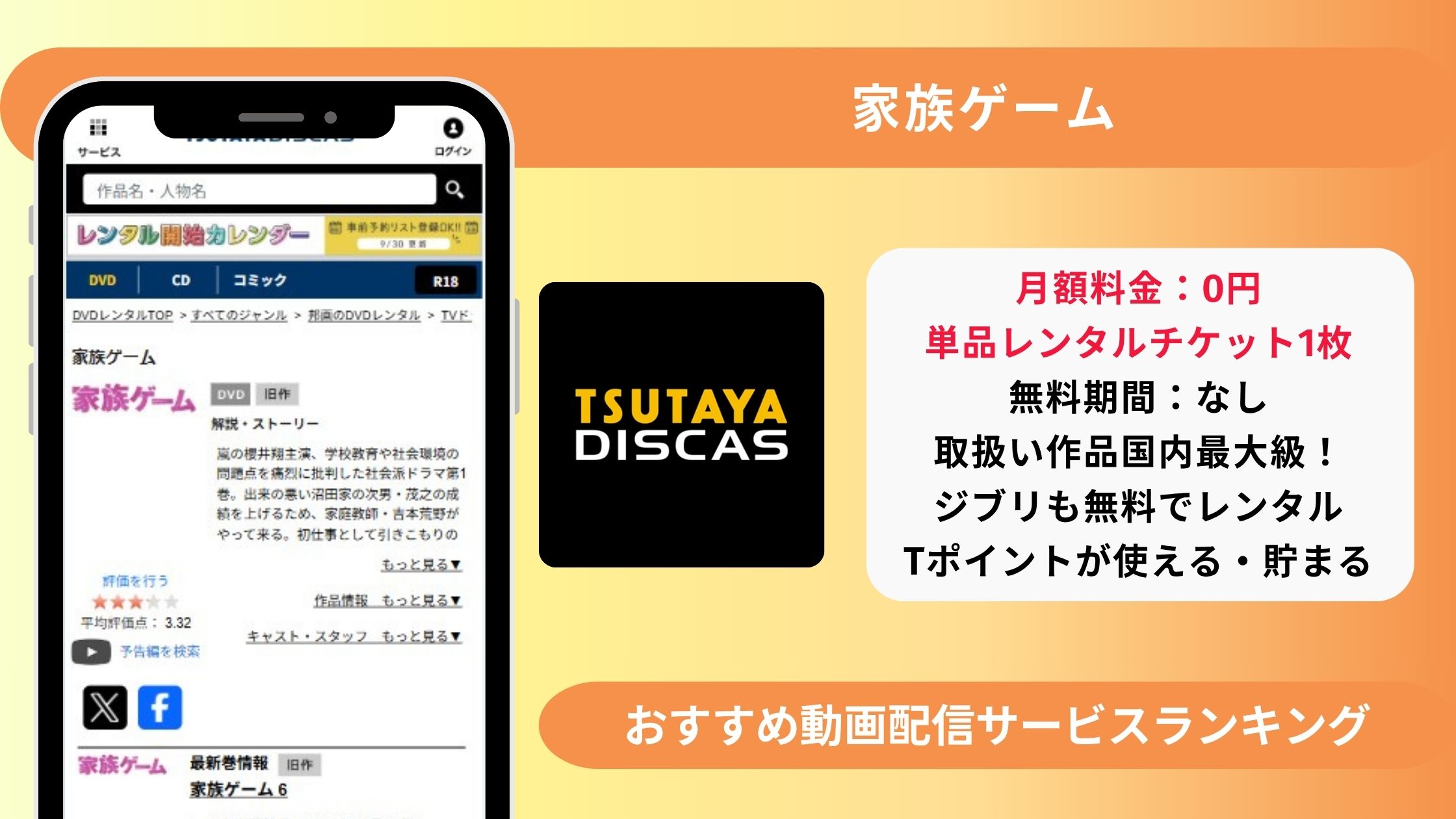 現在、ドラマ「家族ゲーム」を無料視聴できるサービスは、TSUTAYADISCASです!