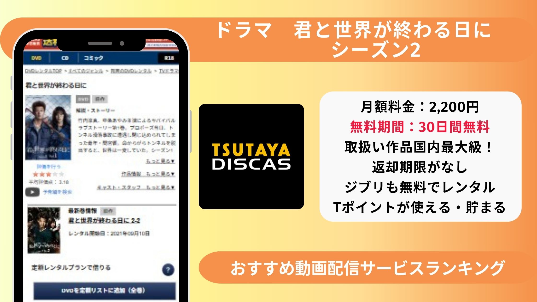 ドラマ「君と世界が終わる日にシーズン2」を視聴できる最もお得な方法は、TSUTAYA DISCASの30日間無料トライアルを利用したDVDレンタルです。