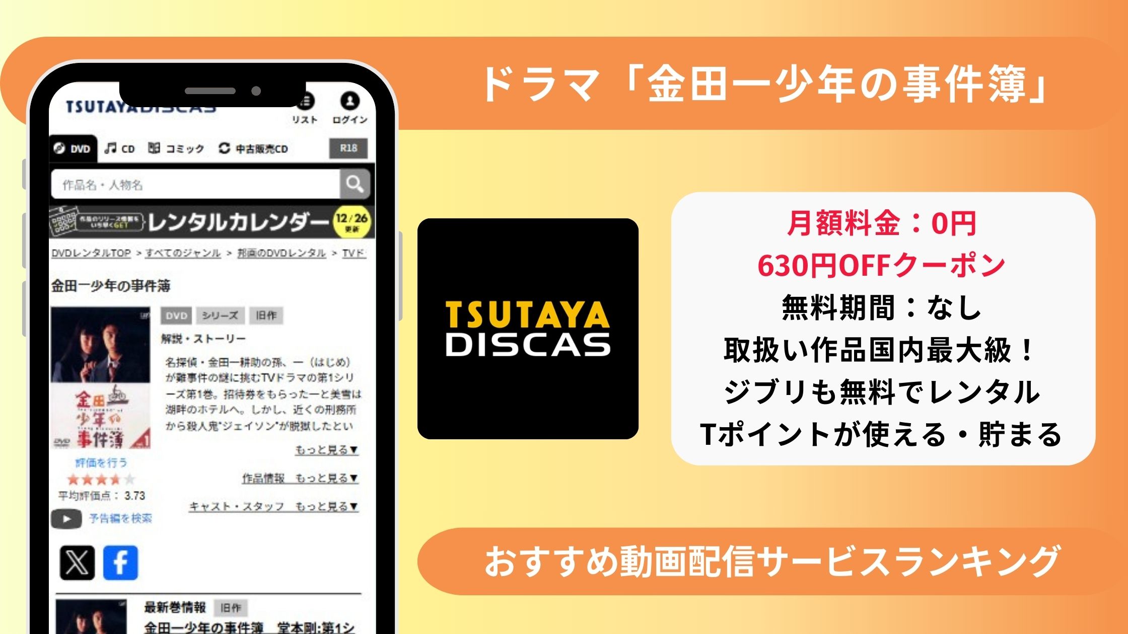 | 特典 | 単品レンタルクーポン630円分プレゼント (630円分で新作なら1枚、旧作なら2枚 借りられます。) |