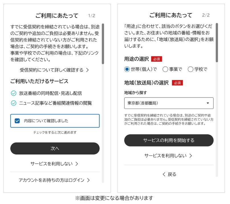 登録なしで視聴できるのは、災害情報や一部のニュース番組のみとなりますので、見逃し配信や通常番組の視聴には、必ず受信料の支払いと本登録が必要です。