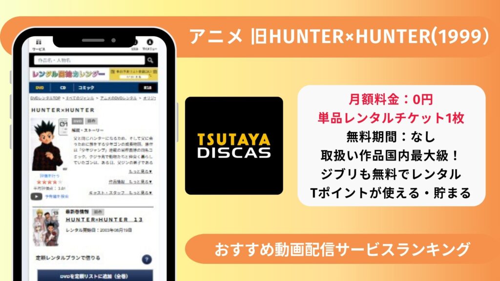 https://www.youtube.com/watch?v=RHBumUYrap4&list=RDRHBumUYrap4&start_radio=1 知りたいことまでジャンプ アニメ「旧HUNTER×HUNTER(1999)」を無料で見る方法は?→TSUTAYADISCASの無料DVDレンタルあり アニメ「旧HUNTER×HUNTER(1999)」はU-N... -