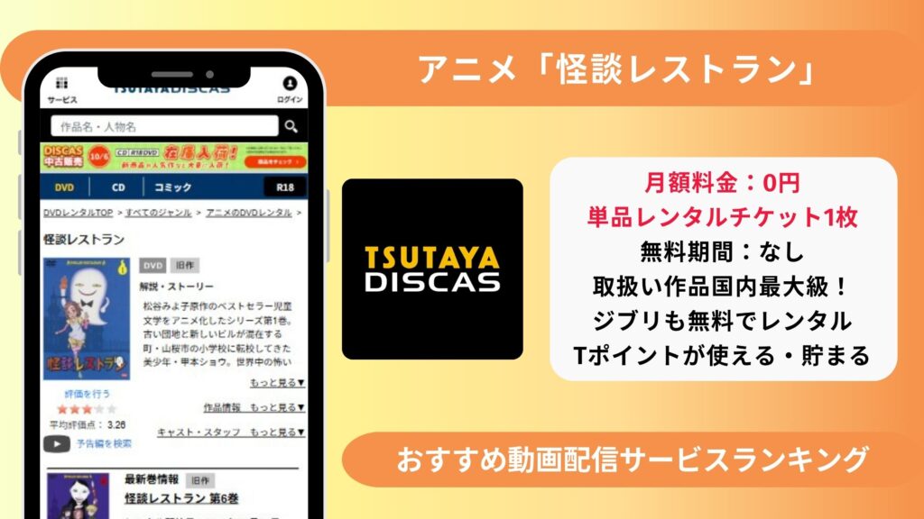 知りたいことまでジャンプ アニメ「怪談レストラン」を見れる配信サイト・アプリを比較 アニメ「怪談レストラン」は TSUTAYA DISCASのDVDレンタルで視聴できる?→DVDレンタルあり アニメ「怪談レストラン」はAmazonプライムビデオ(アマプラ)・Netflix・H... -