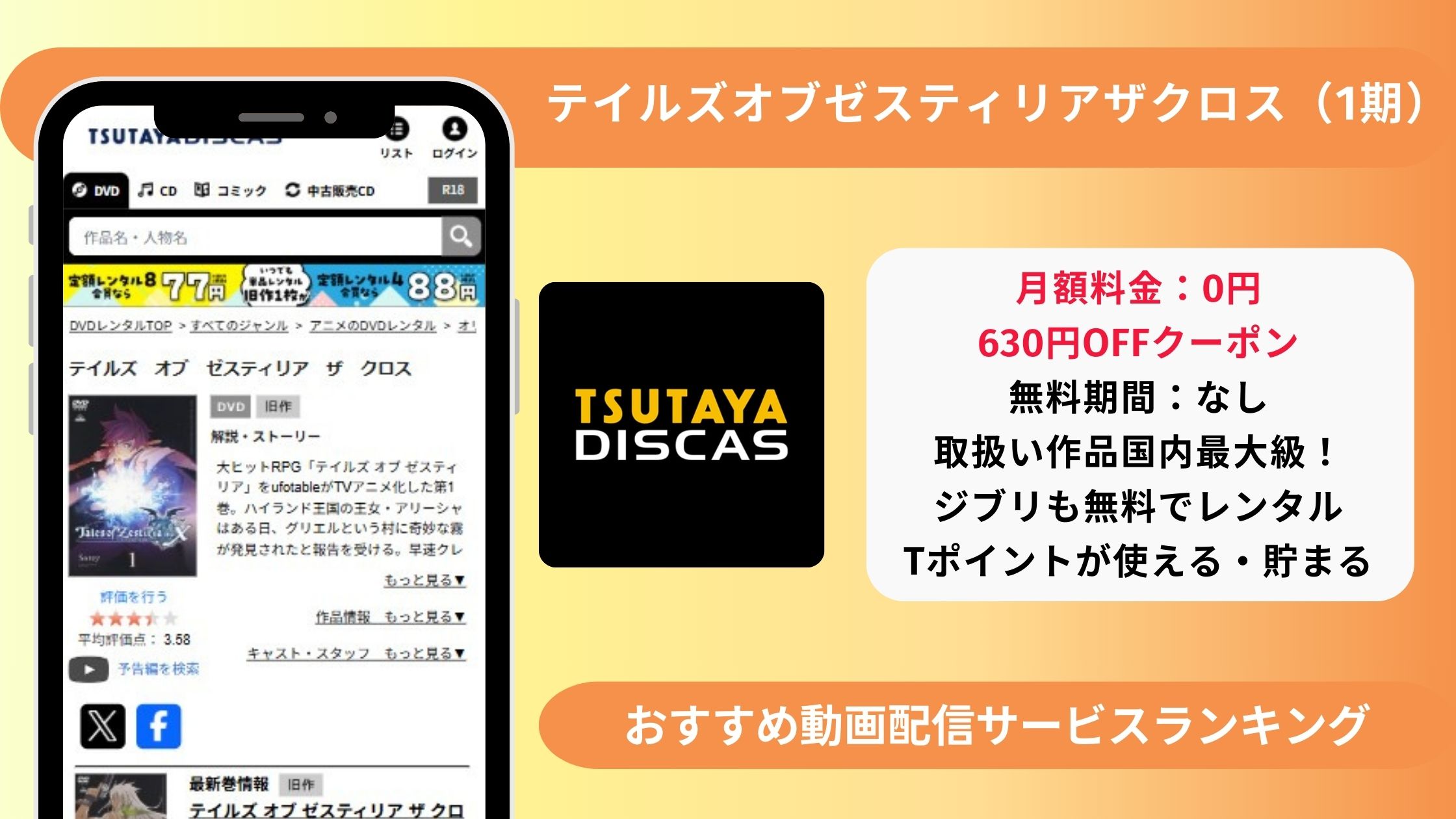 現在、アニメ「テイルズ オブ ゼスティリア ザ クロス(1期)」を無料で見ることができるサブスクリプションサービスはTSUTAYA DISCASの宅配レンタルサービスだけです!