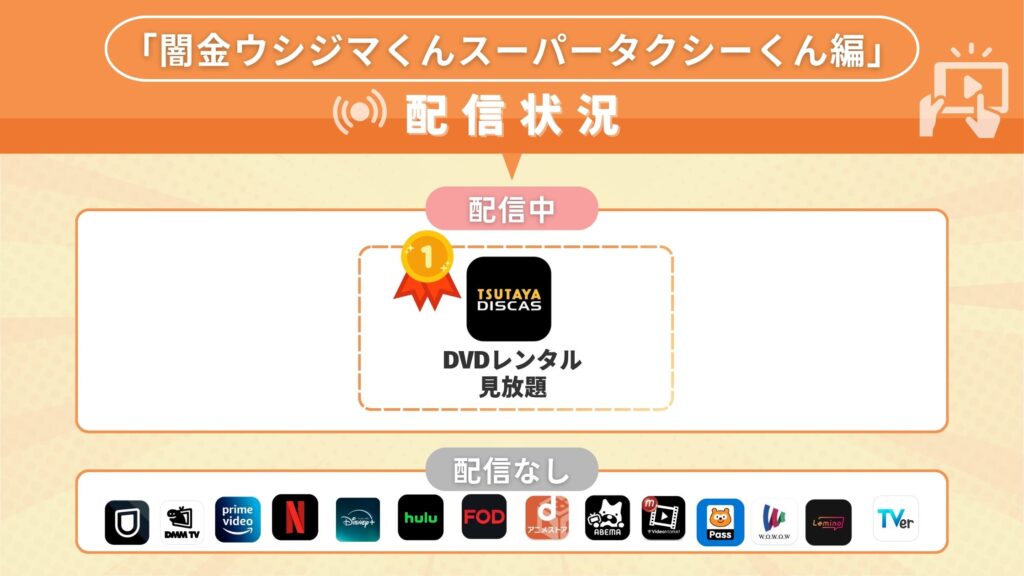 ドラマ「闇金ウシジマくん スーパータクシーくん編」はAmazonプライムビデオ・Netflix・U-NEXTでは配信していませんので、TSUTAYADISCASのDVDレンタルの利用をおすすめします。